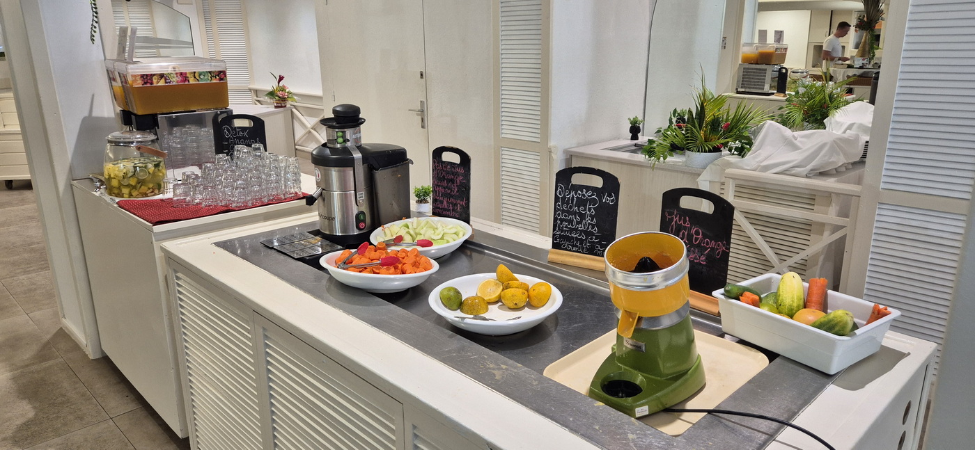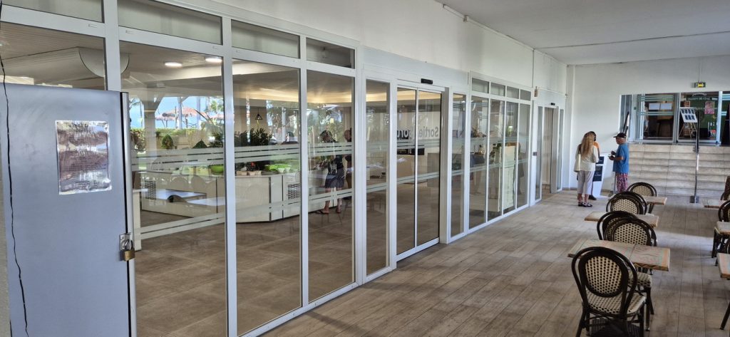 Je leeft hier min of meer buiten. Het pand van het hotel is helemaal open aan de kant van de tuin en ook zit je buiten voor het eten. Wel onder een afdak. Het buffet zelf is wel in een afgesloten ruimte en doet aan de buitenkant een beetje aan als een supermarkt met aparte in- en uitgang.