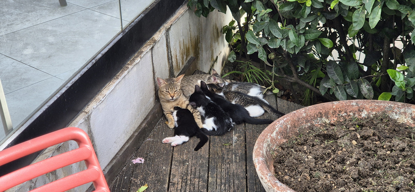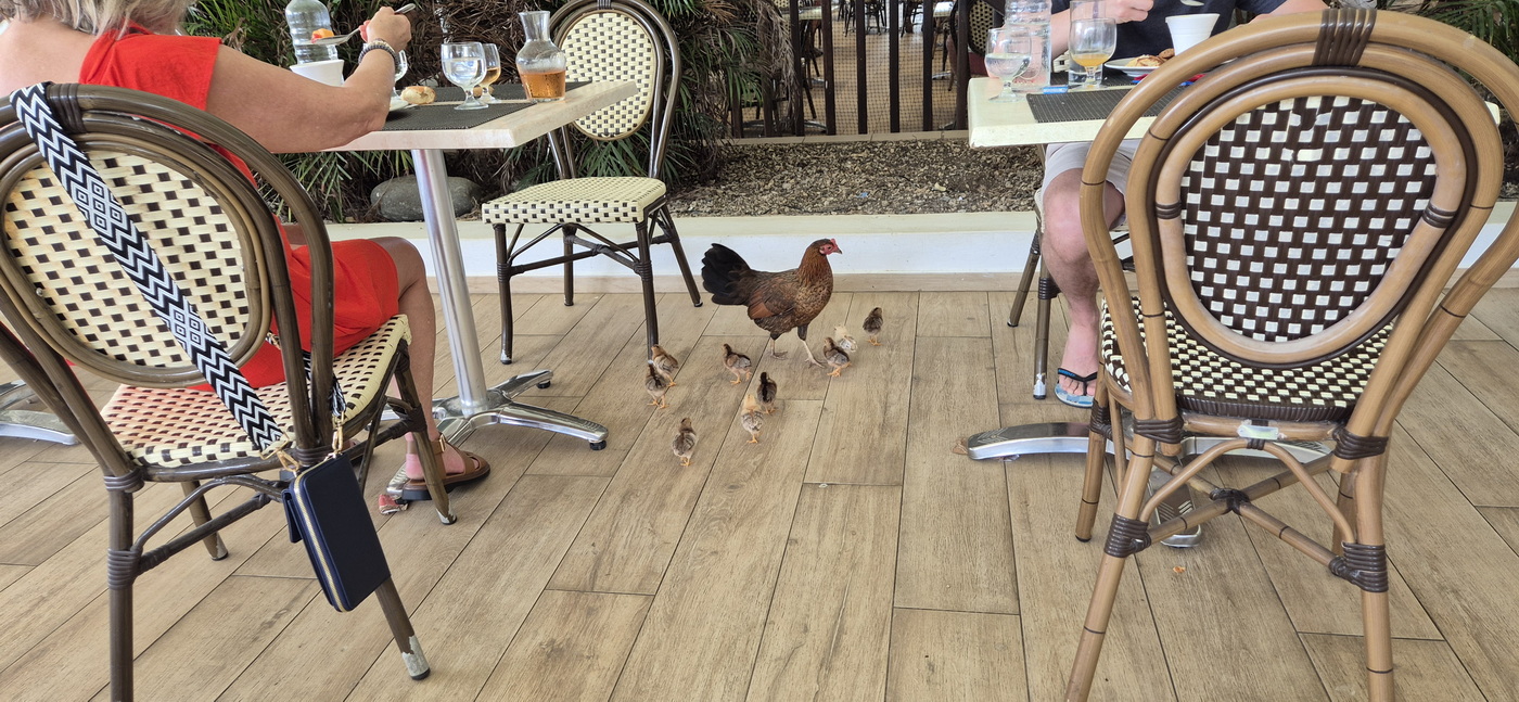 Na de lunch gaan we verder relaxen hier op de terrassen in de tuin, rondom het zwembad en het strand. Tussen het lezen van kranten en boeken door, genieten we van het uitzicht op zee. En van alle dieren die we hier kunnen zien: de kippen met kuikens, de poes met 5 kittens (waarvan er eentje wel wat lijkt op onze Lilah), de grote zeevogels (de bigua-aalscholver?) die naar vis duiken en de krabben op de rotsen bij het strand.