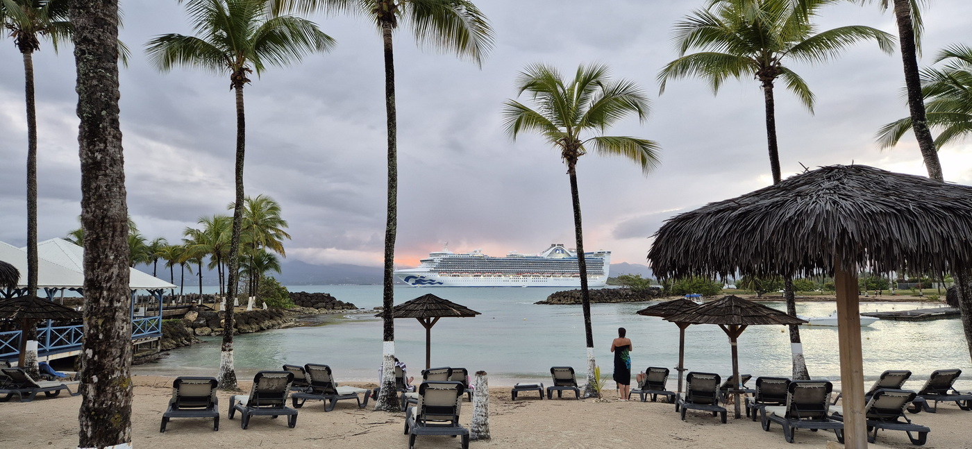 Aan het einde van de middag checkt Jeroen nog even wanneer het cruiseschip vertrekt, wat vandaag in Pointe-à-Pitre ligt. Daar kunnen we nog wel even op wachten. En niet veel later komt opeens de Caribbean Princess langs gevaren. Blijft toch een mooi gezicht, vinden wij. Wie weet kunnen we vrijdagochtend hier onze “eigen” Costa Fascinosa zien binnenvaren.