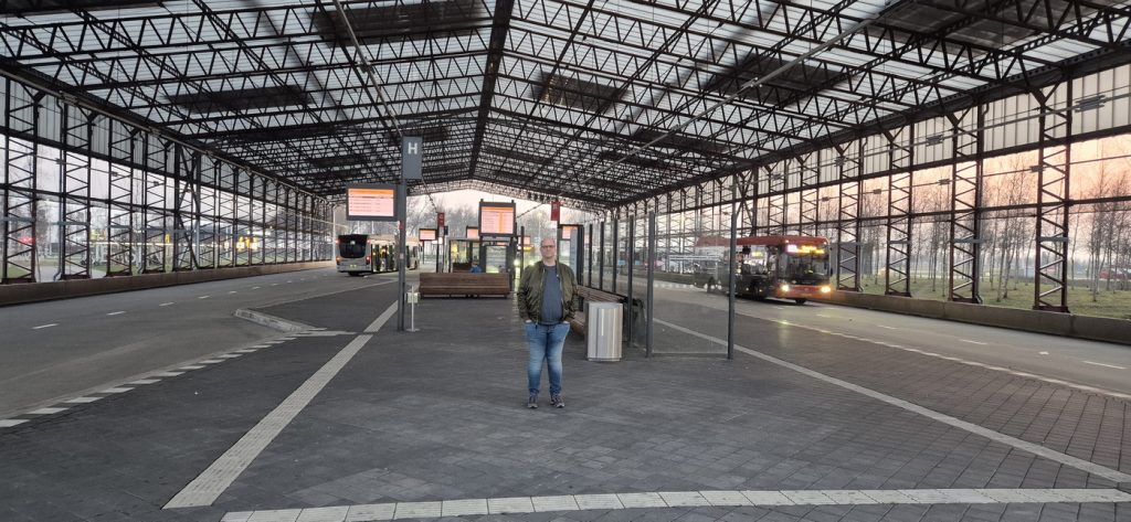 Nadat we de spullen in de kamer gezet hebben, gaan we even de omgeving verkennen. Het Ibis Budget ligt naast het Ibis hotel. Op ongeveer 7 minuten lopen is een overdekt busstation waar met hoge frequentie bussen af en aan rijden, ook naar de terminal, dus dat hebben we morgen als extra optie als het in de shuttle weer zo druk is. Lijn 369, geheugensteuntje: zo heet de eerste ronde van de tv-quiz De Slimste Mens.
