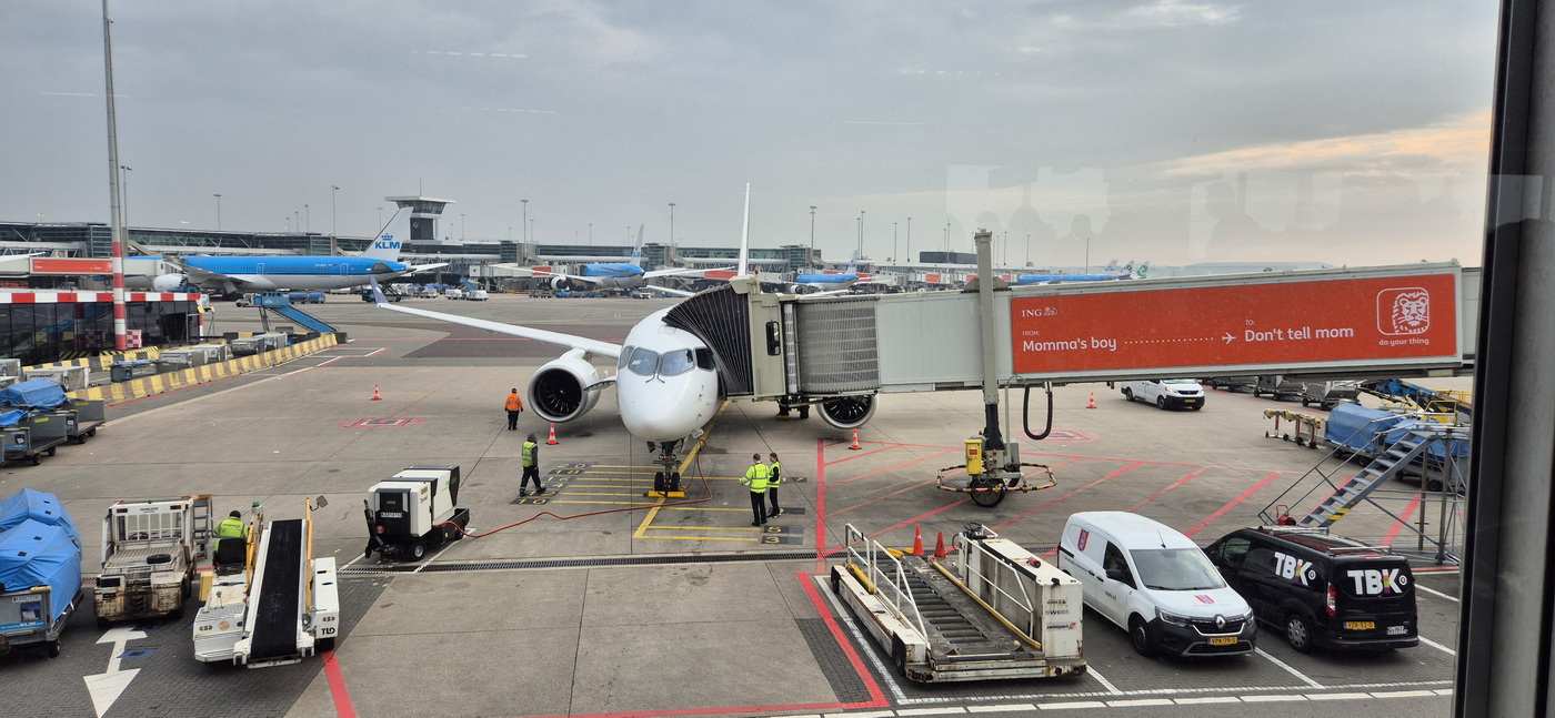 Om half vier stappen we op de trein, die vanwege werkzaamheden aan het spoor een omweg over Alkmaar neemt, waardoor we een half uurtje langer onderweg zijn met een overstap. Aangekomen op Schiphol gaan we een Dutch Burger eten bij Grand Café Plaza (bij Aankomst 3).