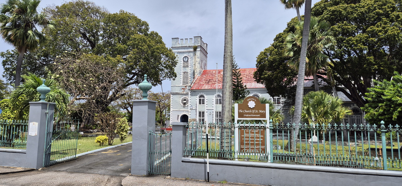 Jeroen wil graag nog even het strand zien aan Carlisle Bay, met inderdaad prachtig turkoois water, en dan vinden we het tijd om weer terug te lopen richting de haven. We nemen een andere route en komen zo nog langs St. Mary Church, een Anglicaanse kerk, die we ook van binnen even bekijken.